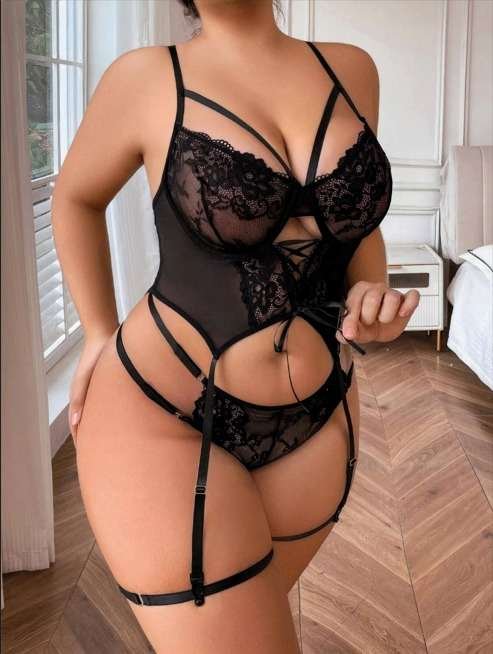 - Complete set: garter belt, thigh-high stockings and matching panties